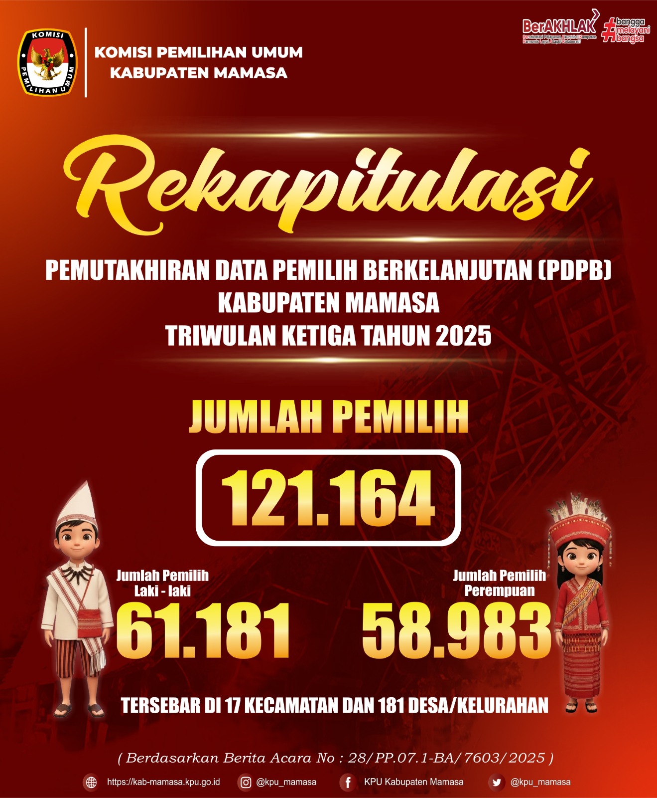 #Teman Pemilih - KPU Kabupaten Mamasa telah menyelesaikan rekapitulasi Pemutakhiran Data Pemilih Berkelanjutan (PDPB) pada Triwulan Ketiga Tahun 2025. Berdasarkan hasil rekapitulasi, jumlah pemilih di Kabupaten Mamasa tercatat sebanyak 121.164 pemilih, dengan rincian: