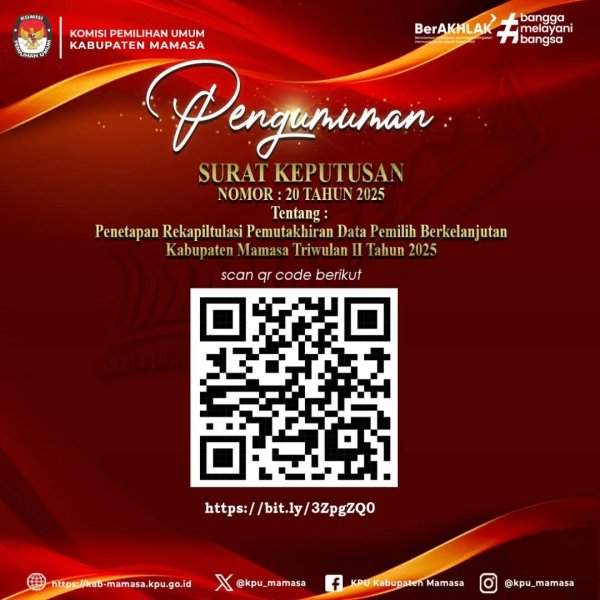 Berikut disampaikan Surat Keputusan Nomor : 20 TAHUN 2025 tentang Penetapan Rekapitulasi Pemutakhiran Data Pemilih Berkelanjutan (PDPB) Triwulan II Kabupaten Mamasa Tahun 2025.
